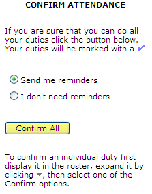 - Setting the ConfIrm flag (blue tick) for your duty lets fellow duty members know your availability, and helps ensure the Officer of the Day is well supported.