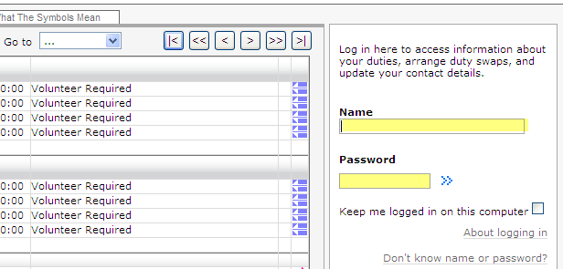 - See your DutyMan 'Welcome" e-mail for your (precise) DutyMan Name (FirstName and Surname) and password