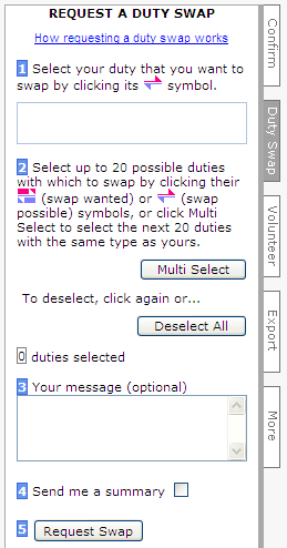 - To Swap duty or Volunteer for a duty, please look to the tabs on the right side of the screen. Follow the instructions on the tab you select:
